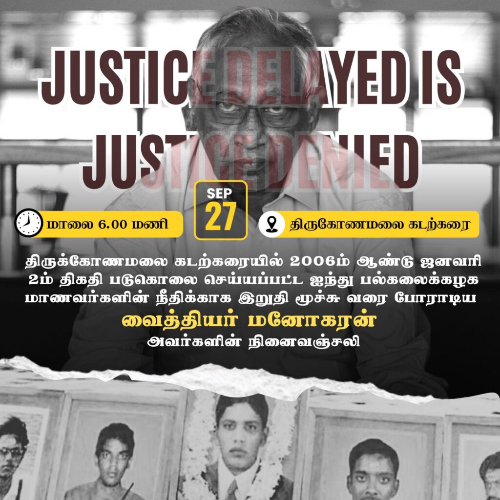 திலீபனின் நினைவு நாட்களின் பின்னணியில்,கடந்த வாரம் லண்டனில் மருத்துவர் காசிப்பிள்ளை மனோகரன் இயற்கை எய்தினார். அவர் யார் என்றால், திருக்கோணமலையில் சுட்டுக் கொல்லப்பட்ட ஐந்து மாணவர்களில் ஒரு மாணவனின் தகப்பன்.தன் மகனுக்கு நீதி கேட்டு அவர் போகாத இடமில்லை.ரணில் மைத்திரி அரசாங்கத்தின் காலத்தில் குற்றம் சாட்டப்பட்ட படையினரில் ஒரு பகுதியினர் கைது செய்யப்பட்டார்கள்.ஆனால் பின்னர் பிணையில் விடுவிக்கப்பட்டு விட்டார்கள். தன் மகனுக்கு நீதி கிடைக்குமா என்று ஏக்கத்தோடு மருத்துவர் மனோகரன் தன் இறுதி மூச்சை விட்டிருக்கிறார.காணாமல்போன தமது பிள்ளைகளைத் தேடிக் கொண்டிருக்கும் நூற்றுக்கு மேற்பட்ட முதிய பெற்றோரும் அவ்வாறு உடைந்த இதயத்தோடு, அவநம்பிக்கையோடு இறந்துவிட்டார்கள்.