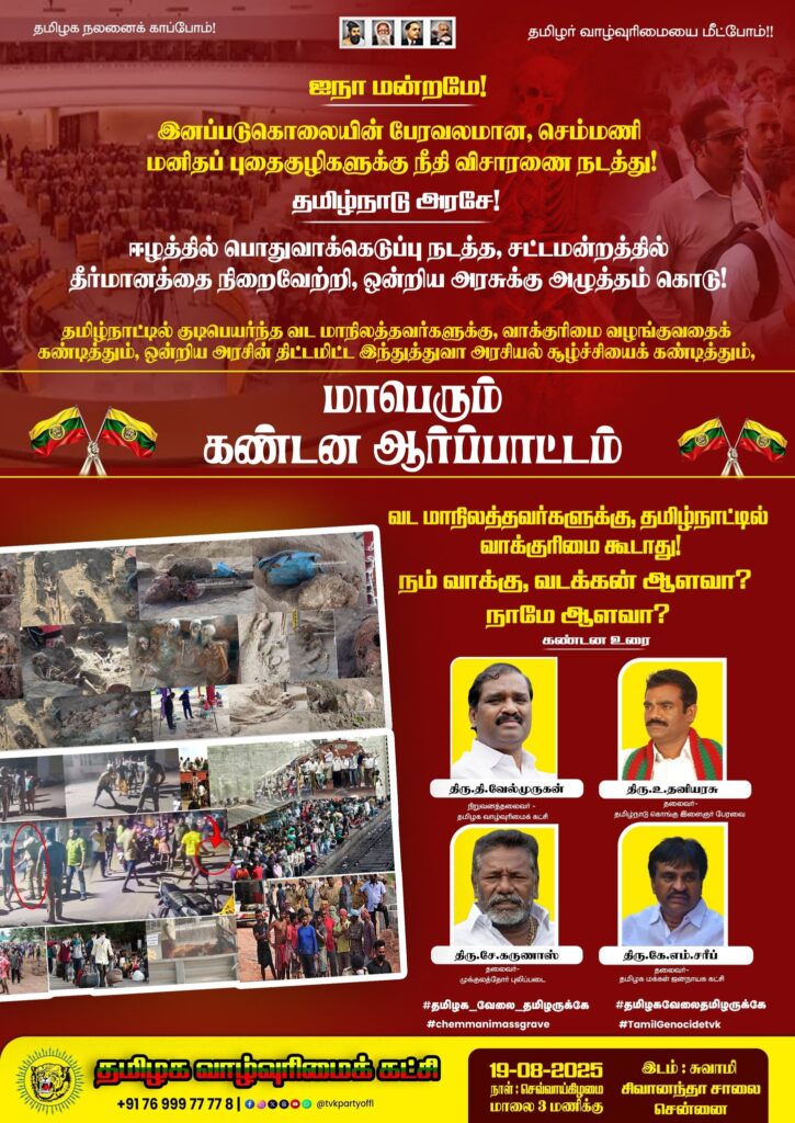 செம்மணிப் புதைகுழி திறக்கப்பட்டிருந்த பின்னணிக்குள்,கடந்த யூலை மாதம் 26 ஆம்திகதி நாம் தமிழர் கட்சியின் ஏற்பாட்டில் சென்னை,ஓமந்தூரார் மருத்துவமனை அருகில் சுவாமி சிவானந்தா சாலையில் ஆர்ப்பாட்டப் பேரணி நடைபெற்றது.கடந்த ஒகஸ்ற் 19ஆம் திகதி தமிழக வாழ்வுரிமைக் கட்சியின் ஏற்பாட்டில் சென்னை,சுவாமி சிவானந்தா சாலையில் ஆர்ப்பாட்டப் பேரணி நடைபெற்றது.இப்பேரணியில்,”ஈழத்தில் நடைபெற்ற இனப்படுகொலைக்கு சாட்சியாக விளங்கும் செம்மணி மனிதப் புதைகுழிகளுக்கு நீதி விசாரணை நடத்தக் கோரி ஐநா மன்றத்தை வலியுறுத்தியும், தமிழ்நாடு சட்டமன்றத்தில் ஈழத்தில் பொது வாக்கெடுப்பு நடத்த கோரும் தீர்மானத்தை நிறைவேற்றி ஒன்றிய அரசிற்கு அனுப்பி ஒன்றிய அரசை வலியுறுத்தக் கோரியும்” கோரிக்கைகள் முன்வைக்கப்பட்டன.ஆனால் இப்பேரணிகள் பற்றியும் அவற்றில் பேசப்பட்ட விடயங்கள் பற்றியும் ஈழத் தமிழர்களுடைய பிரதான ஊடகங்களில் பெரிய அளவுக்குக்குப் பேசப்படவில்லை.